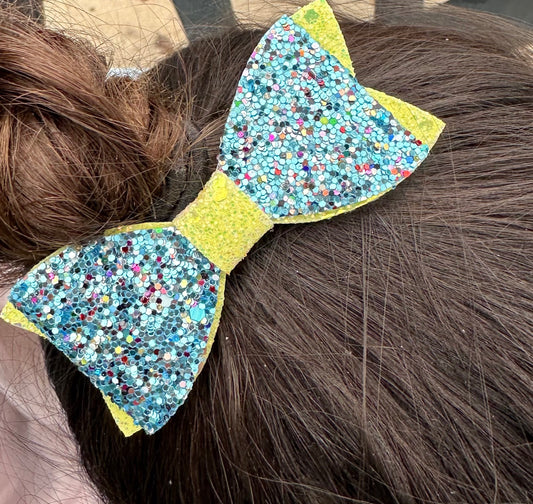 Blue and yellow glitter canvas hair bow